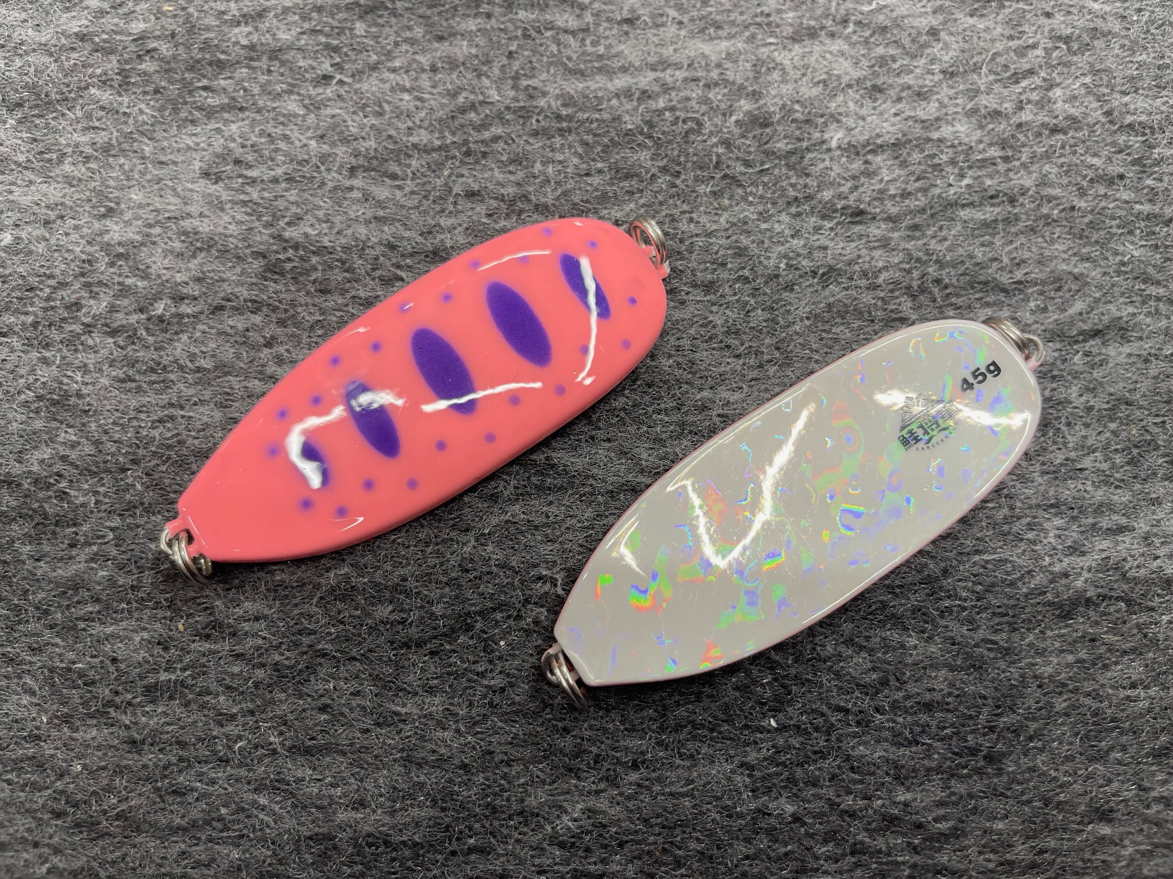 鮭男爵は誰にも負けない飛距離が出し易く、早い潮流に負けることなく泳ぎ、浮きにくいルアー。河口域など潮流が早く、風や波があるフィールドでは、鮭男爵は無双となる。一方、新たに発売される『鮭将軍』は、凪状態の漁港など、ほぼ止水のような状況下にて超デッドスローで引いても確実に水を捉えて動き、水流の受けと抜けがバランスよく入るため、イレギュラーな回転もこなし、アピールし続けられるスプーンを目指しました。ボディに絶妙に計算された反りを持たせ、スプーンの軸をずらして泳ぎの幅をワイドにし、タコベイトの動きをよりダイナミックに演出。またそれによって生じる引き抵抗は、アングラーがルアーの状況を把握しやすくしてくれる。これは幅広いシチュエーションで体感しやすく、アングラーのモチベーション維持にも貢献。鮭男爵と鮭将軍を使い分けることによって、フィールドでの死角はもう残っておりません。