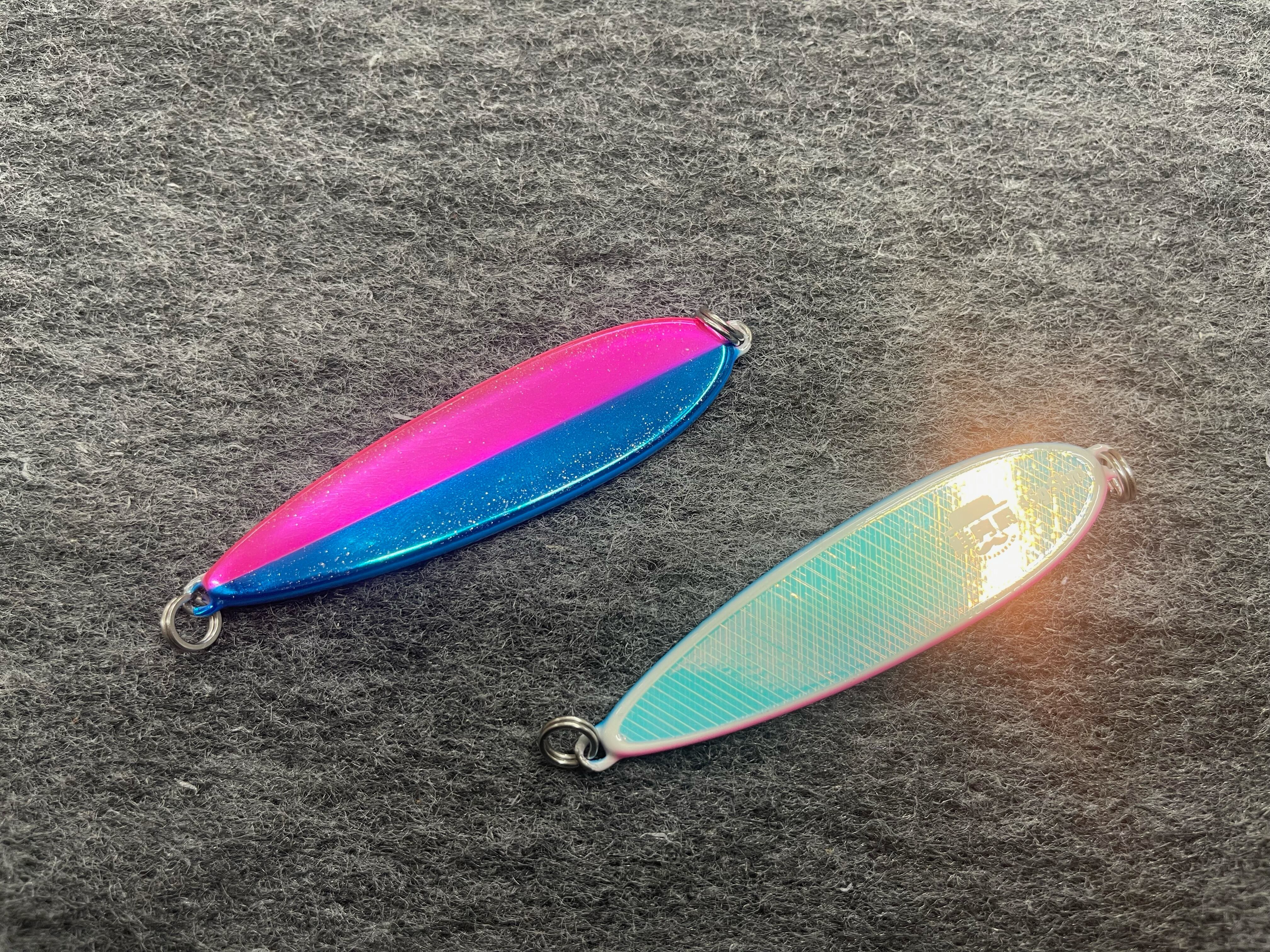 独自のフラット形状ボディは、メタルジグと同じ鉛で成形、コンパクトでありながら空気抵抗の少なさにより飛距離・投げやすさ共に十分。フラット形状であれば、スローリトリーブでも受けた水流を必ず片方向へと全て流そうとするため、タコベイトやエサが付いた高負荷状態でも動けるだけの力を生み出します。そして、樹脂ミラーやマイラーシートを使用することにより、強いフラッシング性能を実現しています。更に、通常のスプーンよりも高比重。動こうとするトルクが高く、エサが落ちるのを待つことがありません。「一投目から最高のアピールを保証する」それが、鮭男爵のフラット形状の秘密なのです。